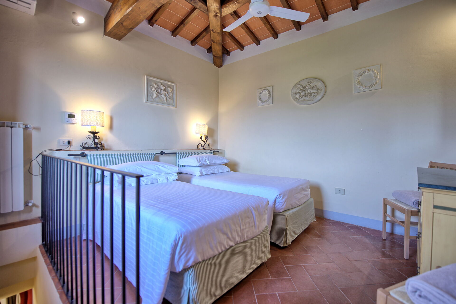 20 steps up (from the living room) bedroom with 2 single beds (air conditioning and ceiling fan)